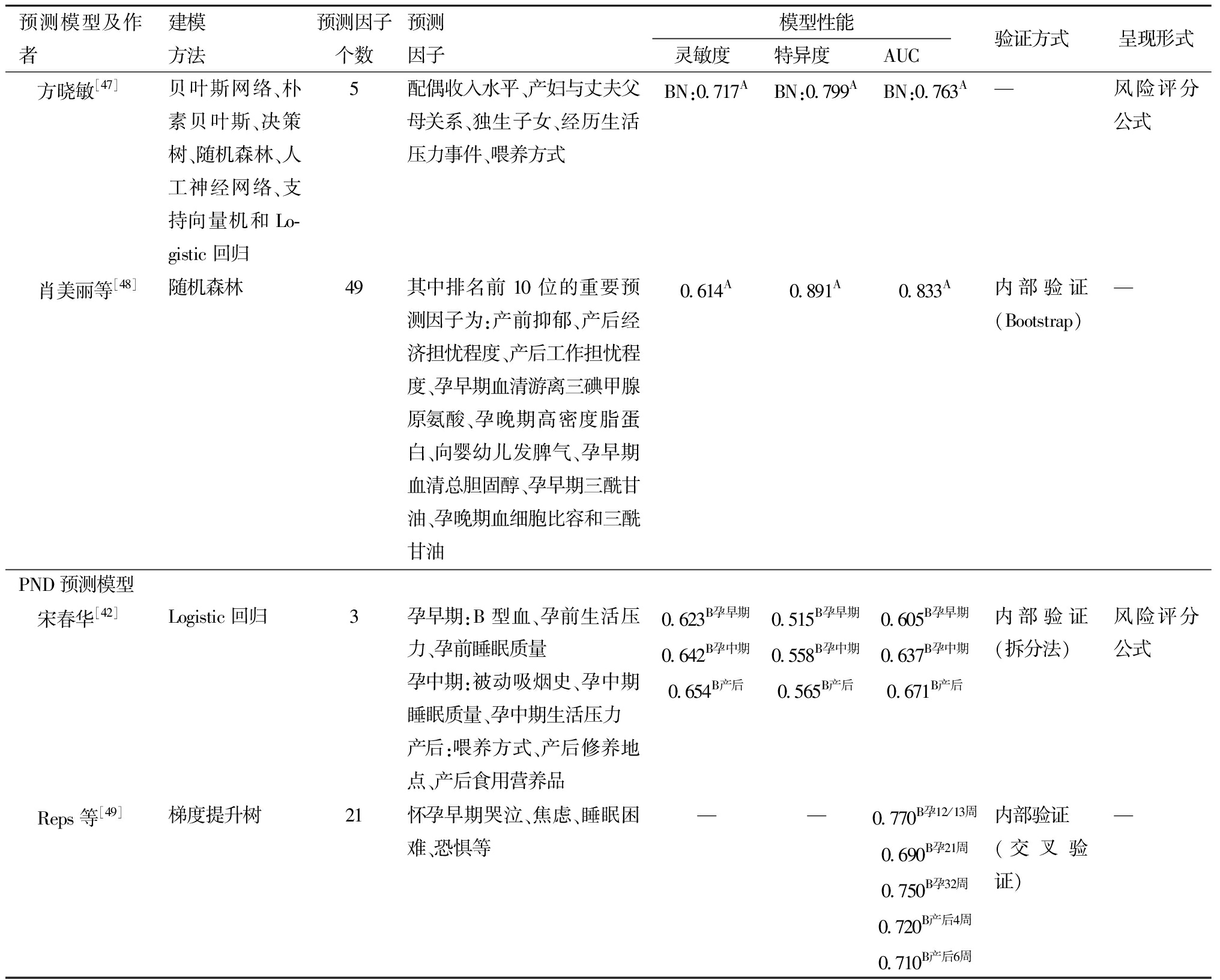 预测模型及作者建模方法预测因子个数预测因子模型性能灵敏度特异度AUC验证方式呈现形式 方晓敏[47]贝叶斯网络、朴素贝叶斯、决策树、随机森林、人工神经网络、支持向量机和Lo-gistic回归5配偶收入水平、产妇与丈夫父母关系、独生子女、经历生活压力事件、喂养方式BN:0.717ABN:0.799ABN:0.763A—风险评分公式 肖美丽等[48]随机森林49其中排名前 10 位的重要预测因子为:产前抑郁、产后经济担忧程度、产后工作担忧程度、孕早期血清游离三碘甲腺原氨酸、孕晚期高密度脂蛋白、向婴幼儿发脾气、孕早期血清总胆固醇、孕早期三酰甘油、孕晚期血细胞比容和三酰甘油0.614A0.891A0.833A内部验证(Bootstrap)—PND预测模型 宋春华[42]Logistic回归3孕早期:B型血、孕前生活压力、孕前睡眠质量孕中期:被动吸烟史、孕中期睡眠质量、孕中期生活压力产后:喂养方式、产后修养地点、产后食用营养品0.623 B孕早期0.642 B孕中期0.654 B产后0.515 B孕早期0.558 B孕中期0.565 B产后0.605 B孕早期0.637 B孕中期0.671 B产后内部验证(拆分法)风险评分公式 Reps等[49]梯度提升树21怀孕早期哭泣、焦虑、睡眠困难、恐惧等——0.770B孕12/13周0.690B孕21周0.750 B孕32周0.720 B产后4周0.710 B产后6周内部验证(交叉验证)—